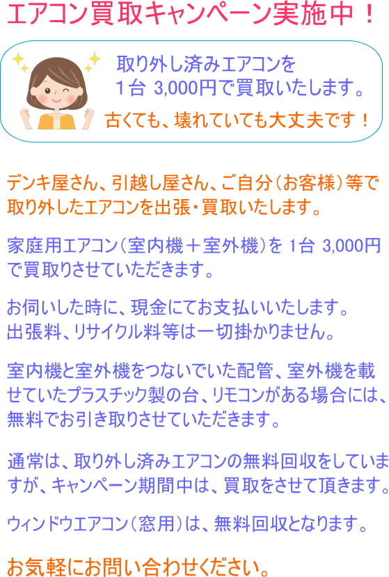 ■ 家庭用エアコン(室内機・室外機)、ウィンドウエアコン(窓用)を無料で、回収(引き取り)させて頂きます。